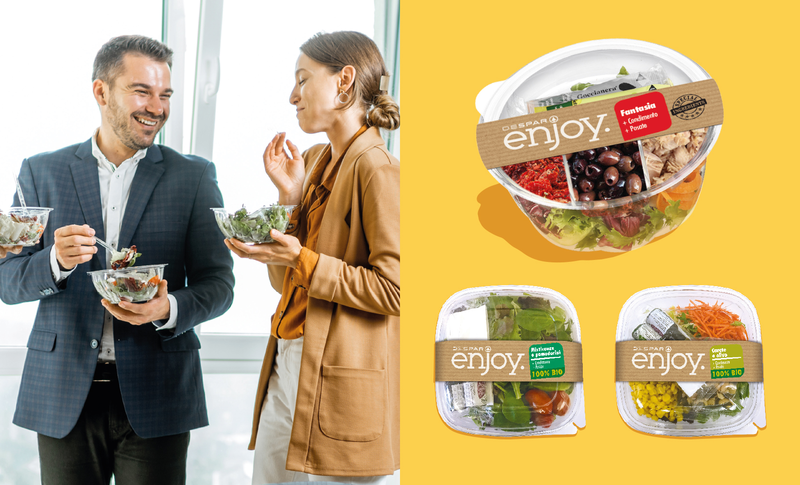 Per i pranzi al lavoro, per un pic nic al parco e per tante altre occasioni, le insalate Despar Enjoy sono la soluzione ideale. Sono 9 gli abbinamenti tra cui scegliere per arricchire i pasti fuori casa con un piatto veloce, pratico e ricco di gusto. Posate e condimenti sono inclusi, per risolvere anche i pasti improvvisati tra un appuntamento e l’altro, oppure un veloce pranzo all’aperto con gli amici.