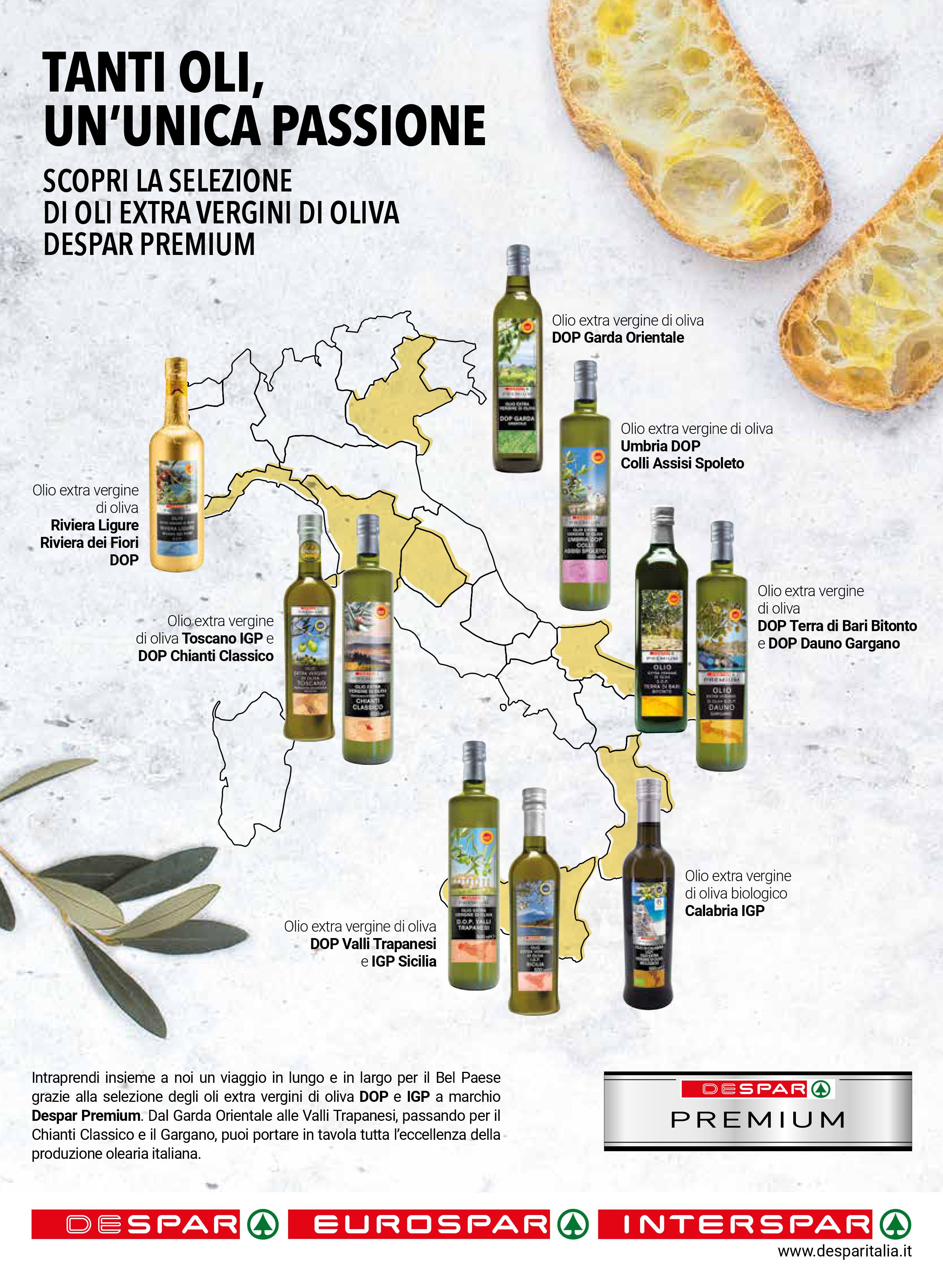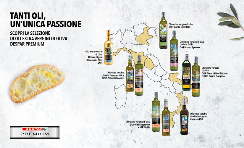 Despar Premium è la linea a marchio Despar che valorizza ed esalta le tradizioni culinarie italiane e del mondo. Tra le oltre 400 referenze che compongono la linea, Despar Premium annovera anche una selezione di oli extra vergini di oliva provenienti da diverse regioni d’Italia. Una sorta di viaggio, quindi, che attraverso l’olio si può intraprendere per assaporare tutti i gusti della Penisola, alla scoperta delle diverse tradizioni regionali che caratterizzano questo prodotto. Gli oli regionali Despar Premium sono certificati DOP e IGP, segno di grande attenzione verso la produzione e la tradizione che caratterizza ognuna di queste referenze.